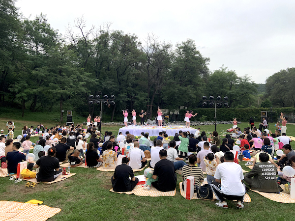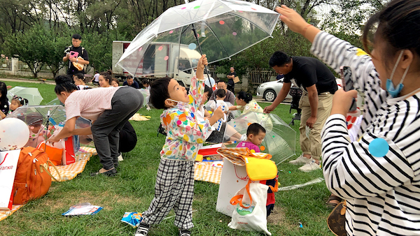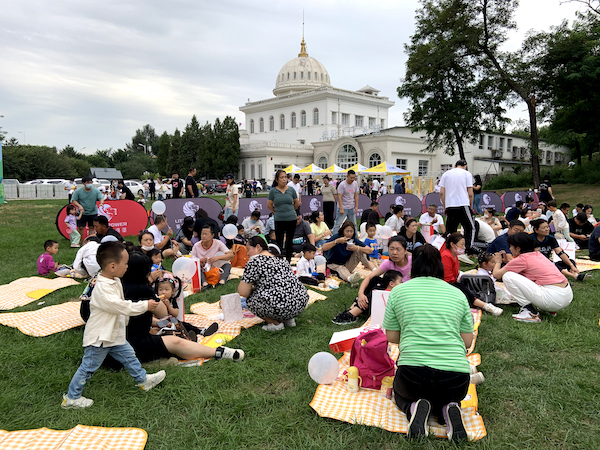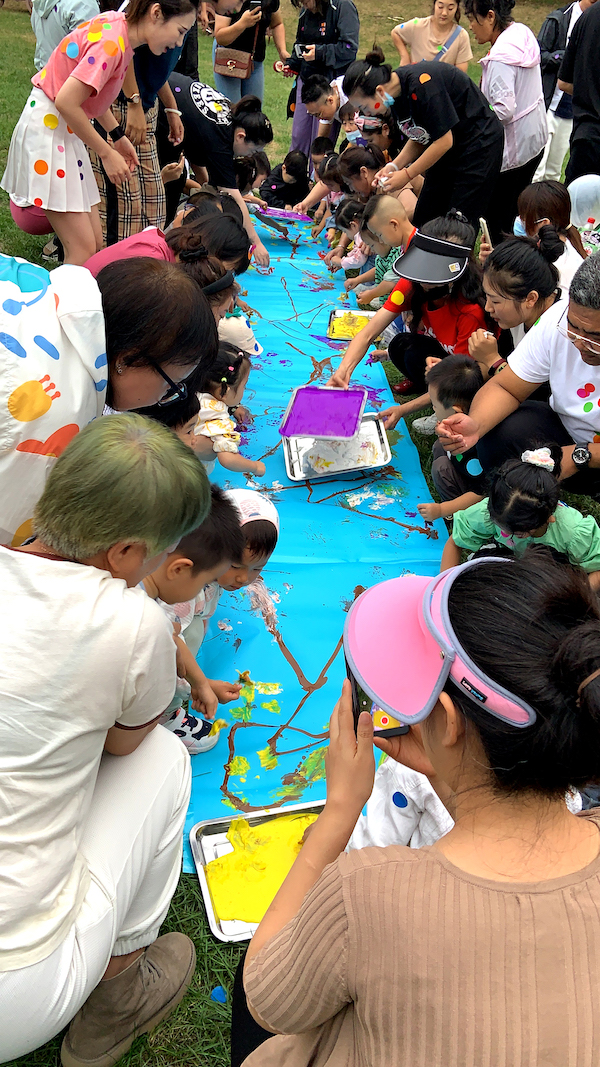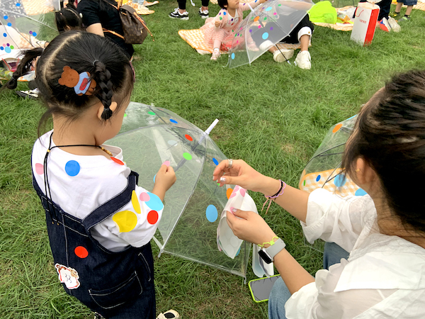 家長帶著小朋友們在簽到處領取禮品后選擇自己的野餐墊